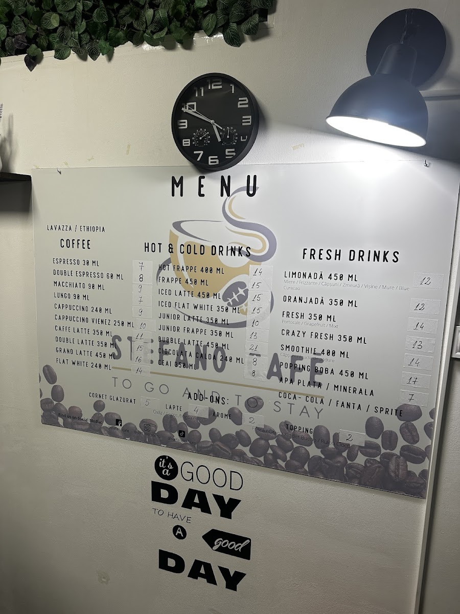 Welcome to Stefano Cafē, a delightful coffee shop nestled at Bulevardul Libertății 2, Târgoviște. This charming establishment is renowned for its exceptional coffee selections and inviting atmosphere. The menu boasts a variety of artisanal beverages to cater to all tastes, including classic Espresso for just RON 7.00, Cappuccino at RON 9.00, and the rich Caffe Latte for RON 11.00. For those seeking a plant-based option, the Vegan Cappuccino and Vegan Latte, made with almond, soy, coconut, or hazelnut milk, are must-tries, priced at RON 13.00 and RON 15.00, respectively.